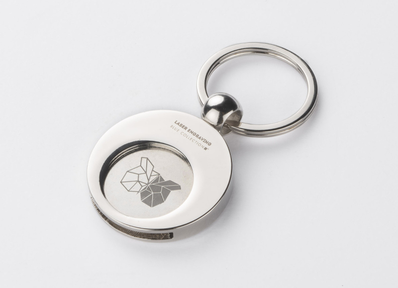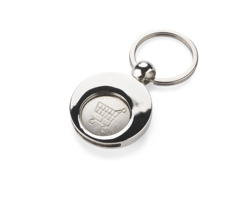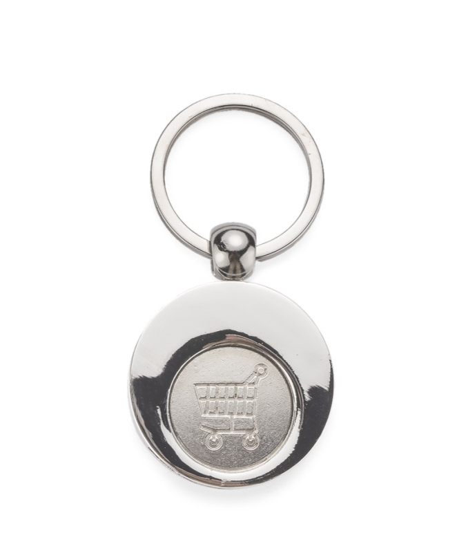 Kovová klíčenka s žetonem, chromovaným povrchem. Tento token se hodí pro vozíky v supermarketu. Na tokenu lze provést gravírování.