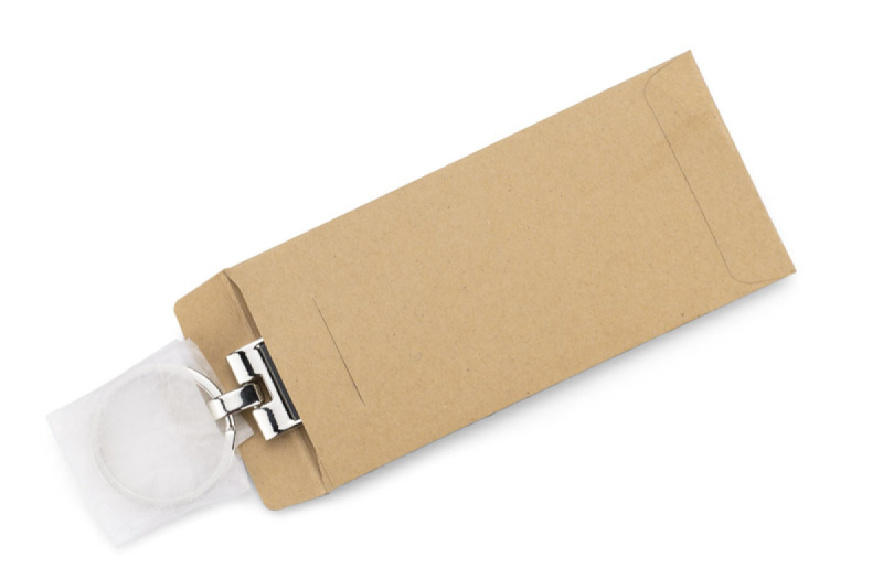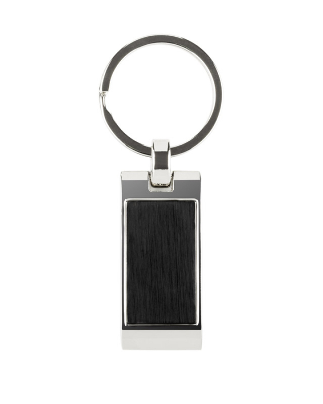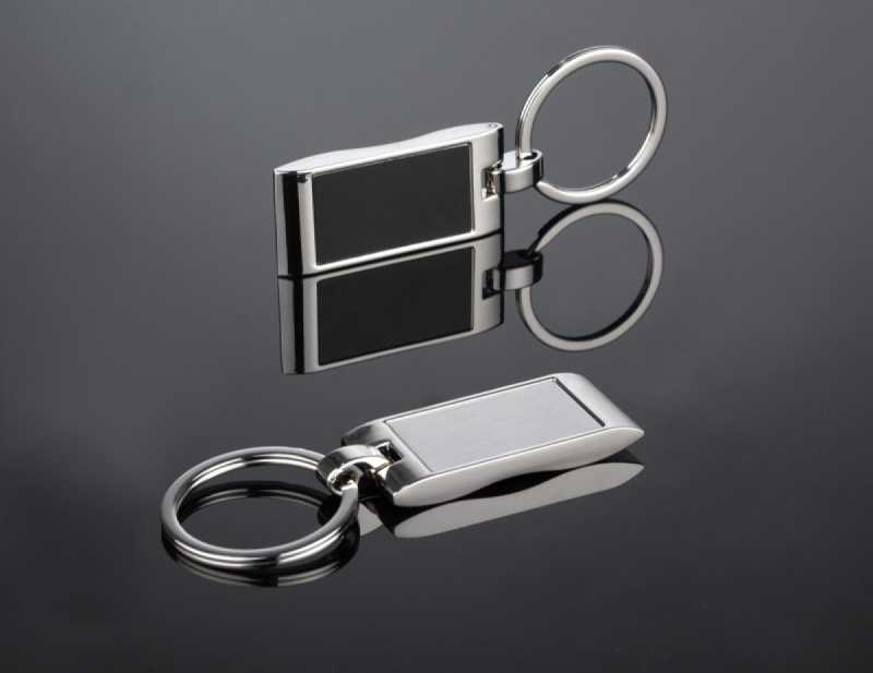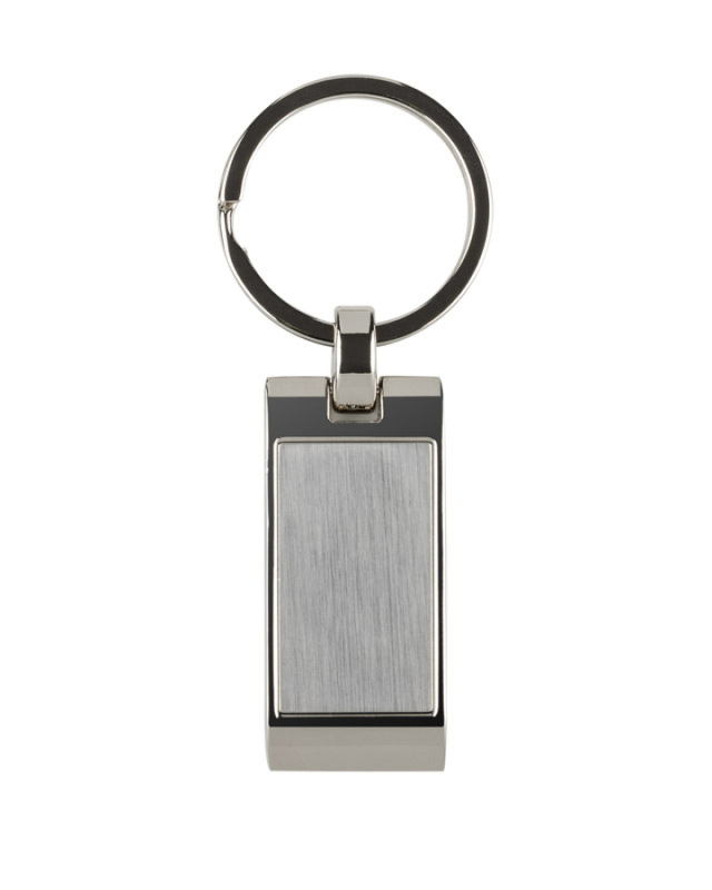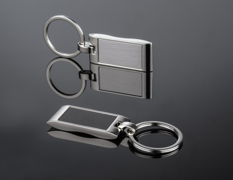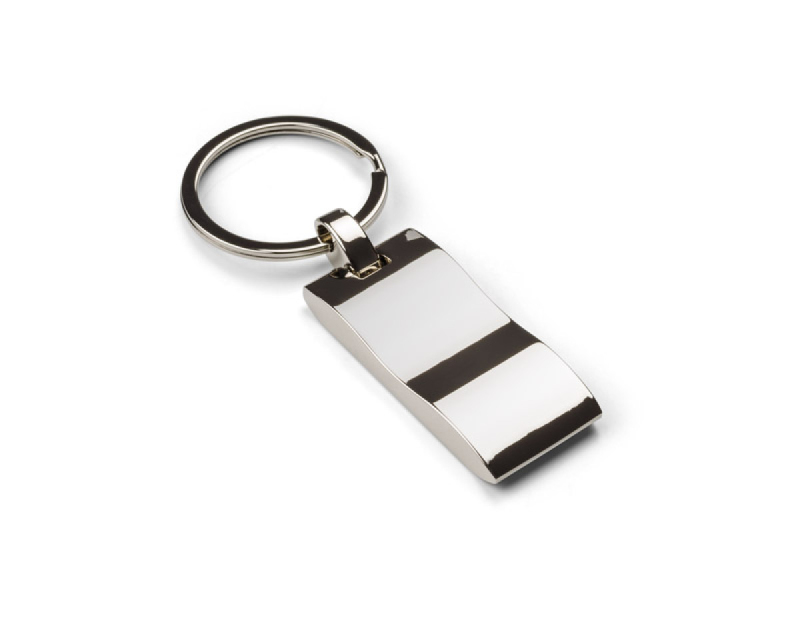 Kovová klíčenka s obdélníkovým, zvlněným přívěskem. Logo bude vyryto na povrchu přívěšku.