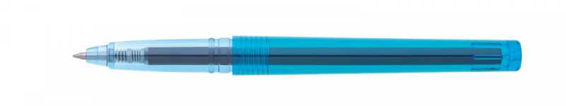 Gelová propiska s víčkem, transparentní tělo s neprůhledným víčkem a klipem vhodným pro potisk. Gelová náplň je modře píšící, 800m.