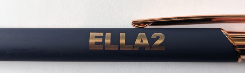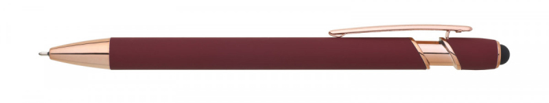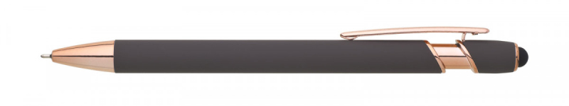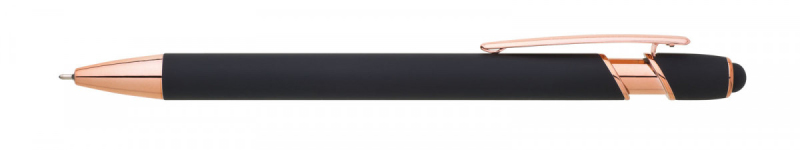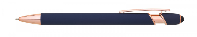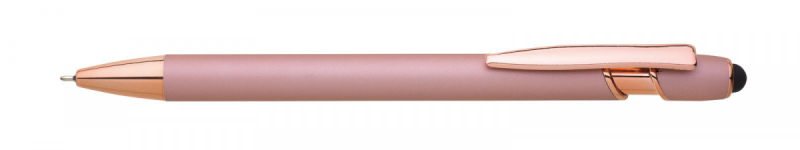 Kovová propiska se soft povrchem, touch koncovkou a doplňky v růžovo-zlaté barvě. Laserované logo je lesklé, růžovo-zlaté. Náplň semigelová, modře píšící.