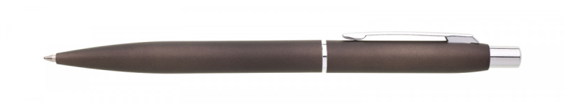 Kovová hnědo-bronzově pogumovaná propiska se stříbrnými doplňky a efektem lesklého stříbrného laseru.