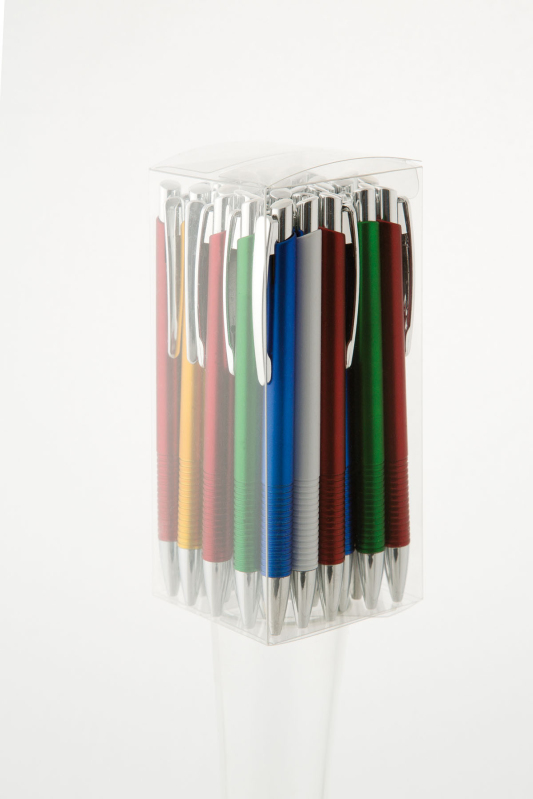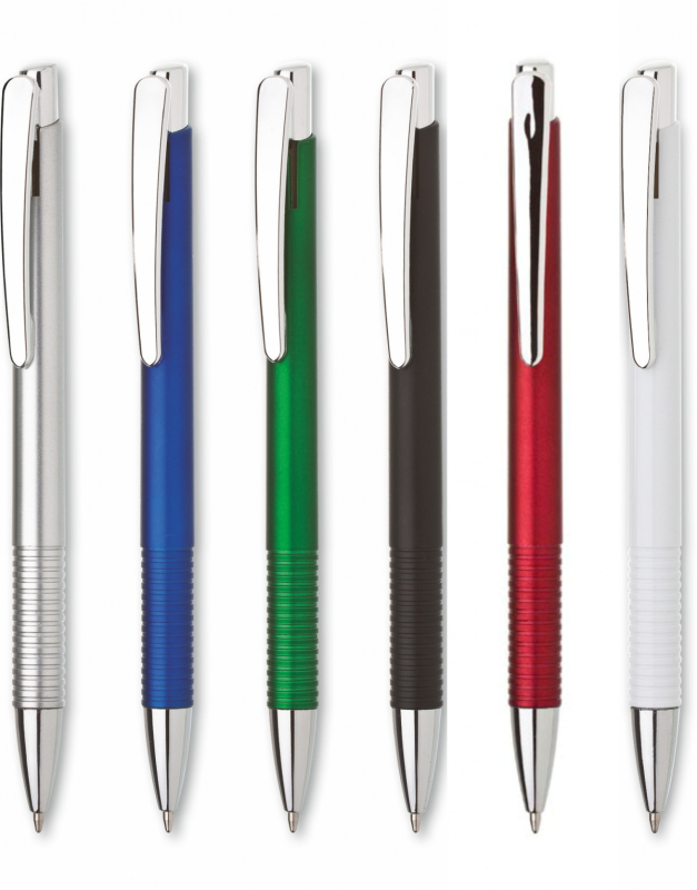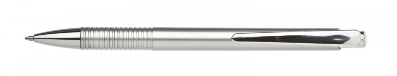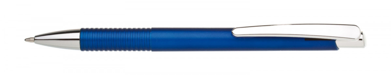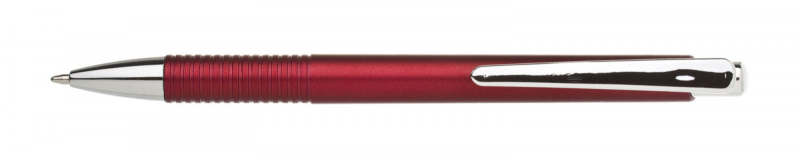 Plastové, kuličkové pero LASTI má červené, metalické tělo s rýhovaným úchopem a pochromovanou špičkou, klipem a cvakátkem. Náplň X 20- 10,6 cm, modře píšící.