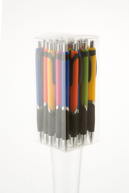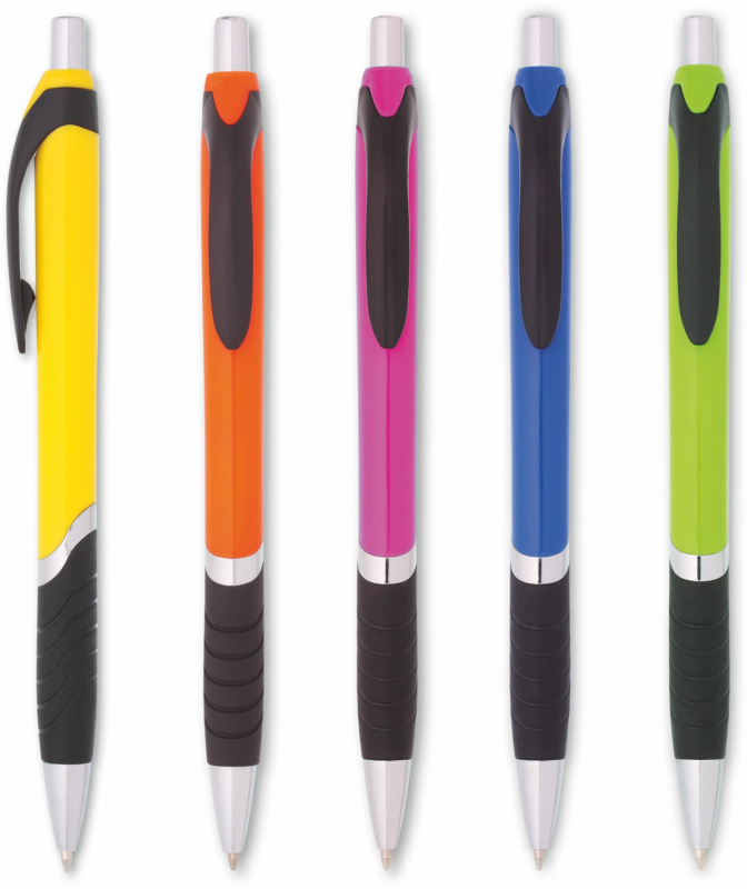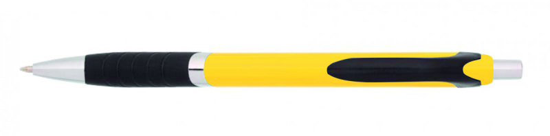 Plastové propisovací pero PEINA žluté. Pero má černý pogumovaný úchop s vroubky, zakončený stříbrným šikmým poružkem.Klip je včerné barvě. Náplň je X20 , píše modře.