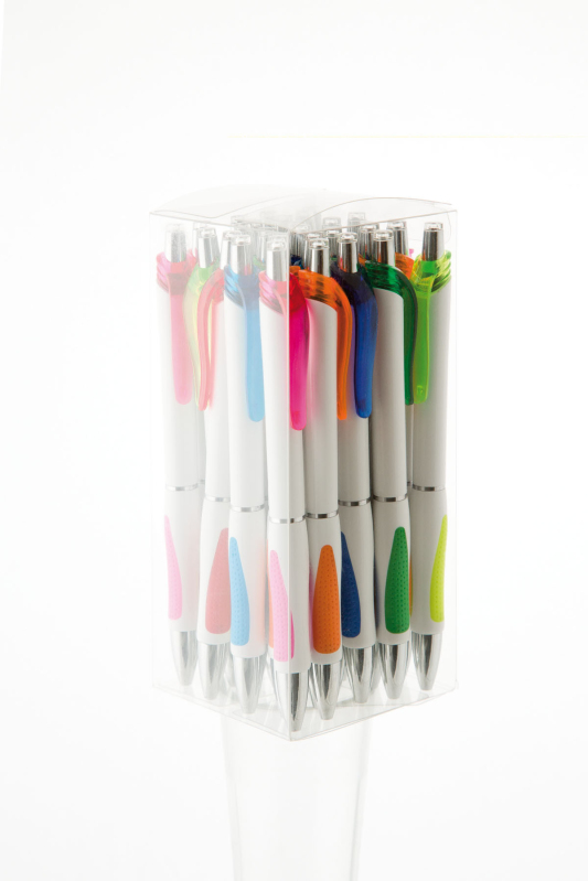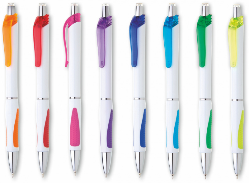 Bílá, plastová propiska s pochromovanými doplňky jako jsou klip, tělo cvakátka a proužek uprostřed těla tužky. Grip je oranžový, částečně pogumovaný, stejně jako klip. Náplň X 20 s mikrohrotem, modře píšící.