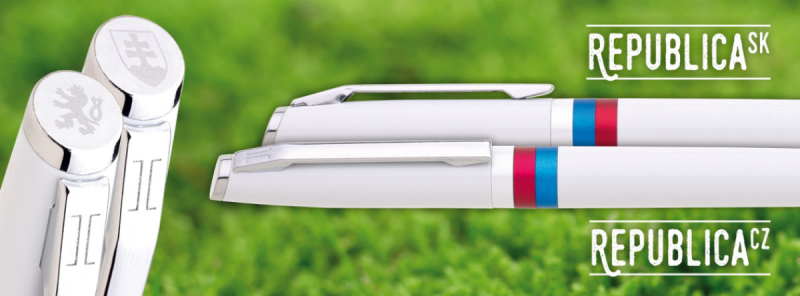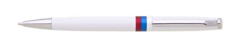 Bílá otočná propiska s trikolórou a tiskem znaku Slovenské republiky. Náplň X20, modře píšící.