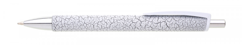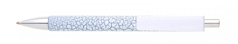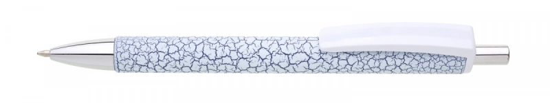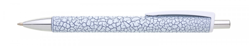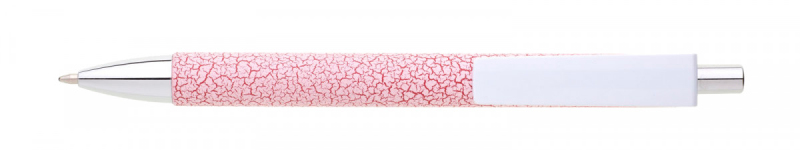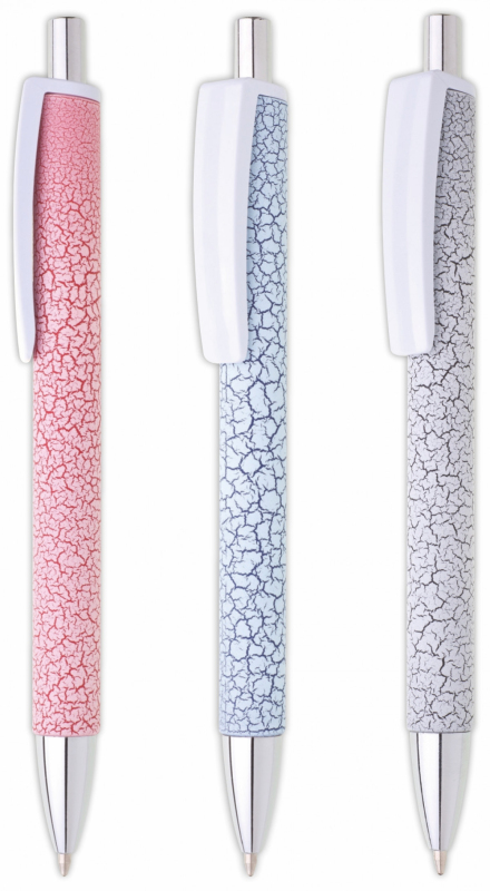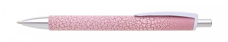 Plastová propiska SINAY s efektem rozpraskaného povrchu. Co kus to originál. Špička a cvakátko jsou pochromované, klip je z bílého plastu, tělo růžové. Náplň velkoobsahová, modře píšící.