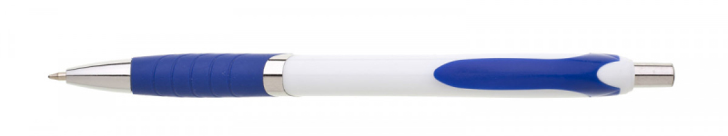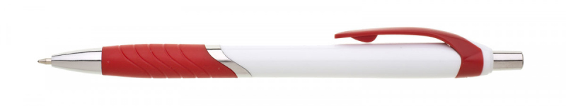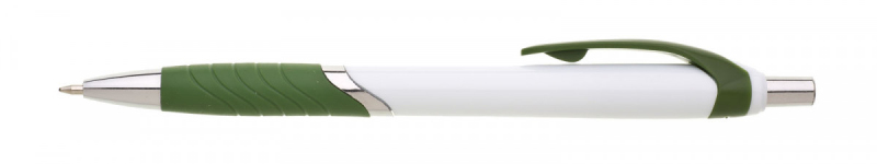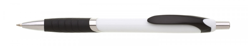 Plastová propiska s bílým tělem s žlutým úchopem a klipem a stříbrnými doplňky.