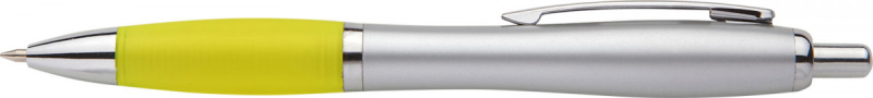 Plastové propisovací pero TERNO se stříbrným tělem. Barva pogumovaného úchopu je žlutá. Je zdobené stříbrným proužkem, ostatní doplňky jsou také stříbrné. Náplň je velkoobsahová, modře píšící. Kolekce EVERGREEN.