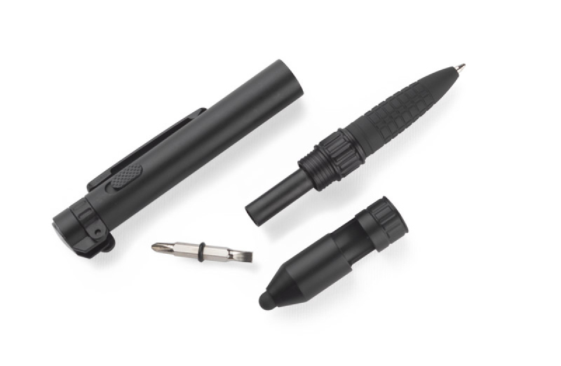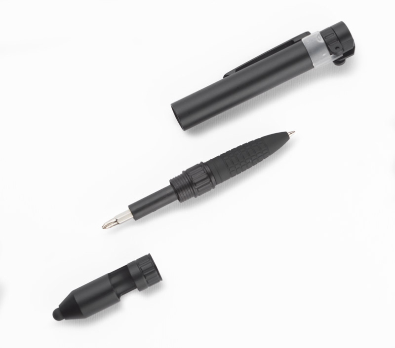 GYVER bude perfektním dárkem pro příznivce serepetiček, kteří očekávají, že reklamní předměty budou vybavené překvapujícími funkcemi. Tento malý předmět je vybaven 7 funkcemi: propiskou, touch penem, stojanem na telefon, baterkou, 2 šroubováky, kompasem. Náplň v modré barvě.