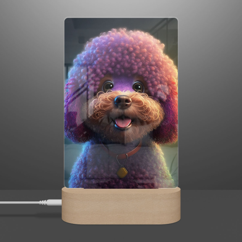 Součástí balení je akrylové sklo dle výběru, dřevěný RGB LED stojánek a napájecí USB kabel.
