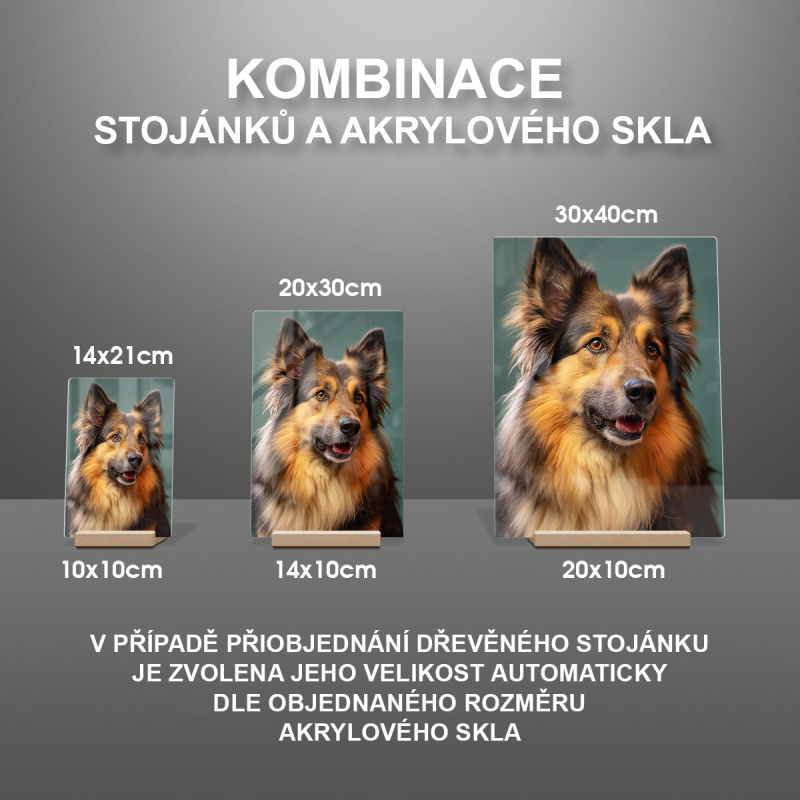 V případě přiobjednání dřevěného stojánku je zvolena jeho velikost automaticky dle objednaného rozměru akrylového skla viz produktové foto.