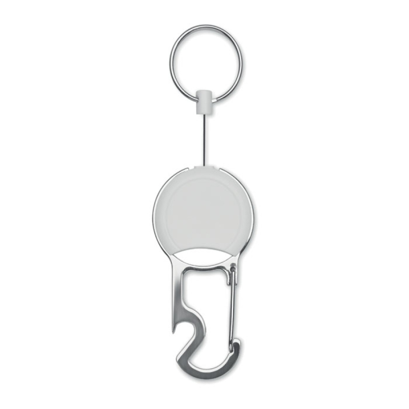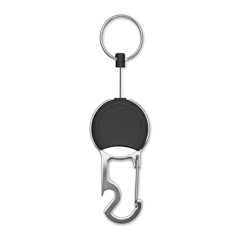 Samonavíjecí držák z ABS s klipem, kroužkem na klíče a otvírákem na lahve.