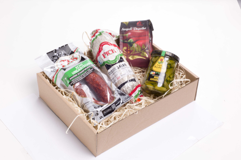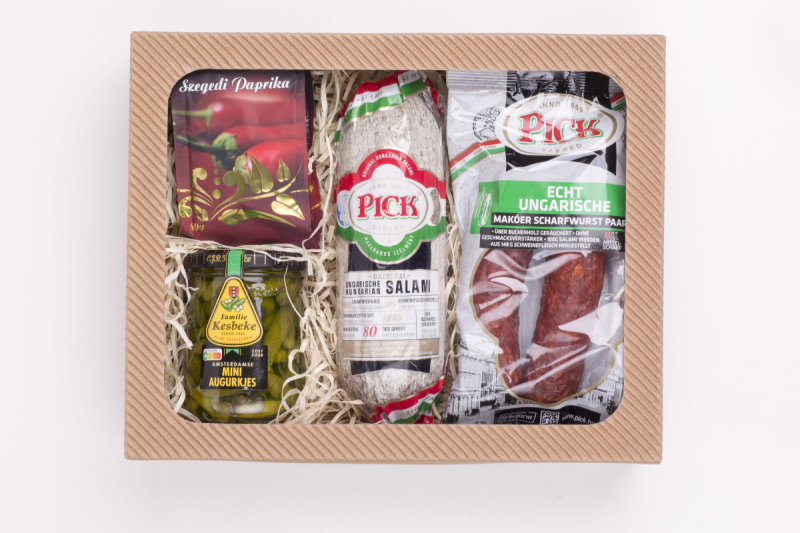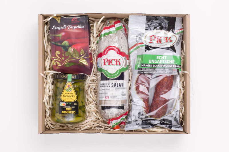 Obsahuje: Uherský salám Pick 400 g, maďarská klobása Makói 200 g pálivá, Szegedi paprika 80 g, Cornichons okurčičky 250 ml. Trvanlivost: 40 dní.