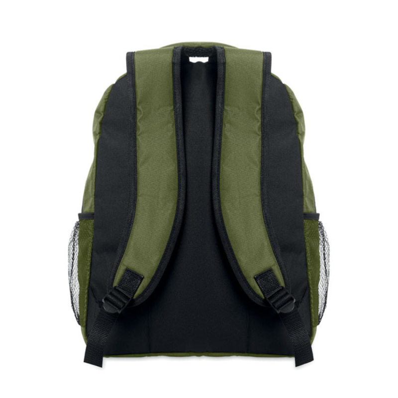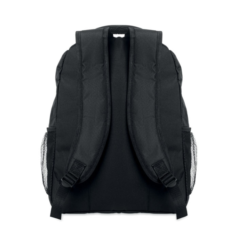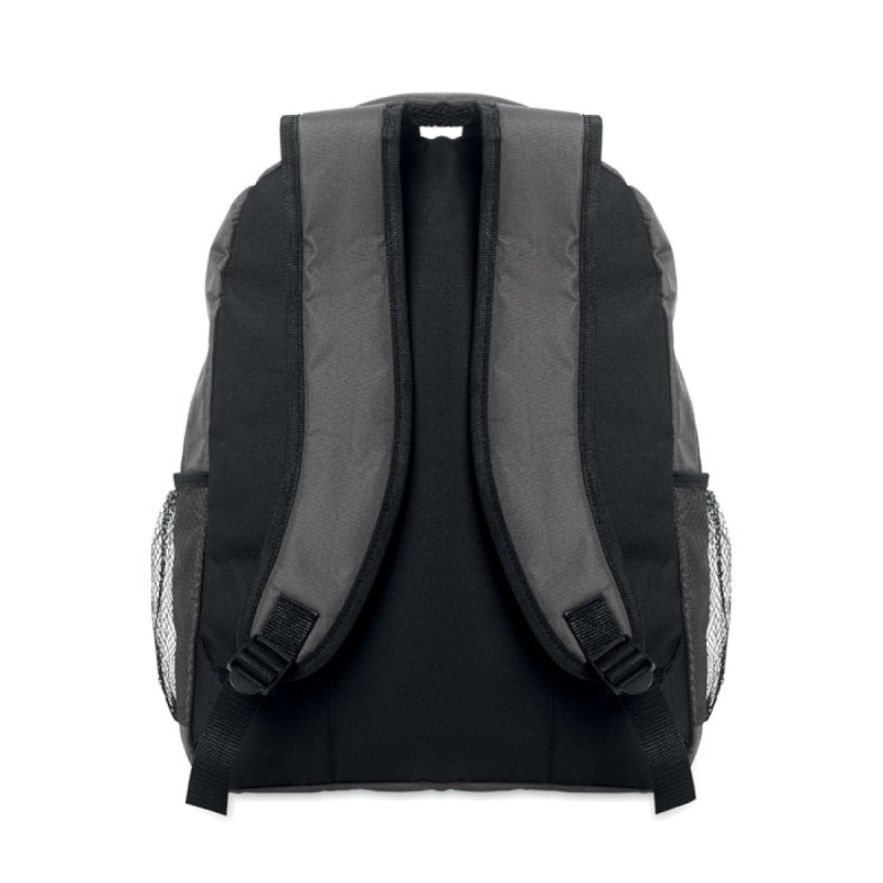 Batoh z polyesteru 600D RPET s polstrovanou přihrádkou na 15palcový notebook uvnitř, síťovanými kapsami na obou stranách a přední kapsou na zip.