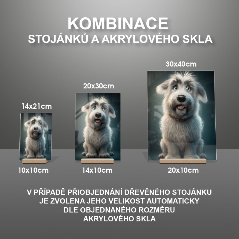 Na produktovém fotu vyobrazena nejoblíbenější varianta akrylového skla 14x21cm a dřevěný stojánek 10x10cm.