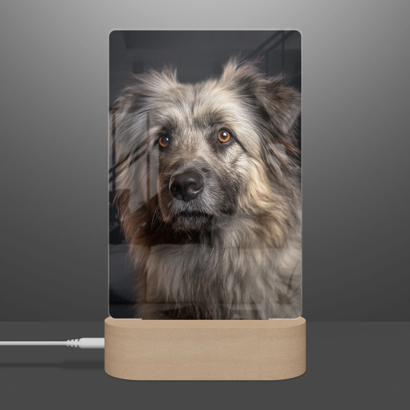 Součástí balení je akrylové sklo dle výběru, dřevěný RGB LED stojánek a napájecí USB kabel.
