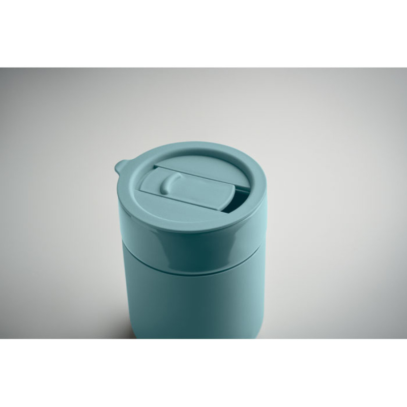 Keramický pohárek se silikonovým odnímatelným návlekem a víčkem z PP. Objem: 330 ml.