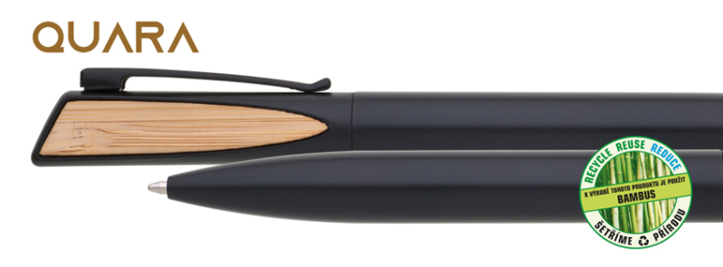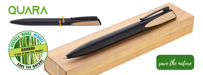 Otočná černá kovová propiska zdobená bambusovou vsadkou vhodnou pro značení logem.