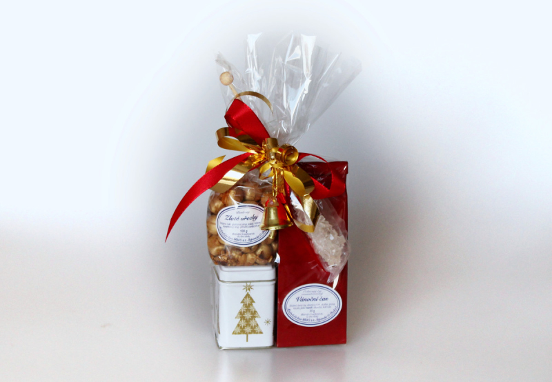 Obsahuje: Bonbony Zlaté ořechy 100 g, Vánoční čas - černý čaj 30 g, ozdoba zvoneček, cukrkandl na špejli, plechovka na čaj
