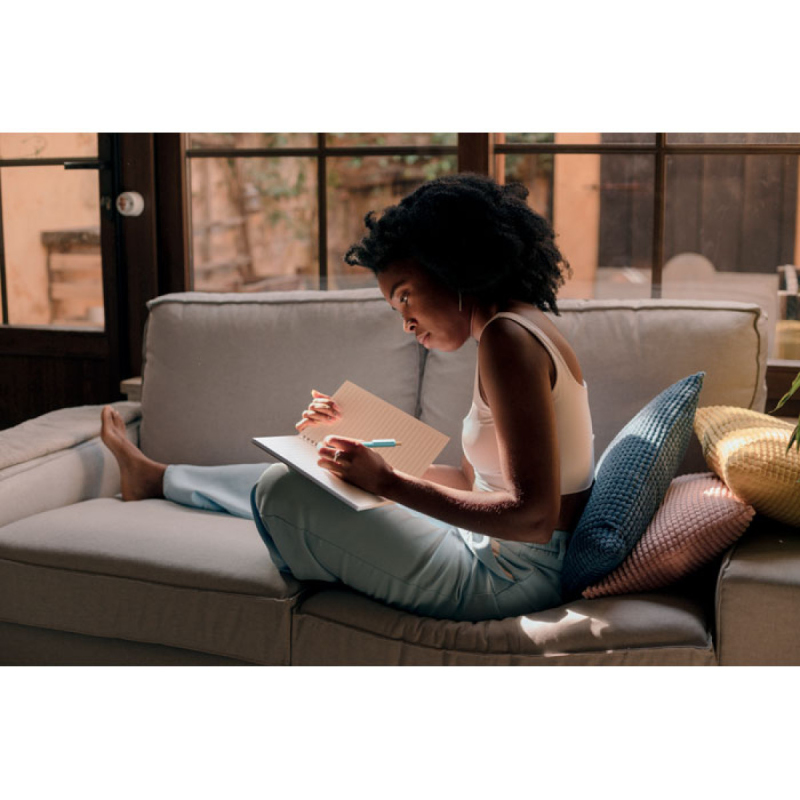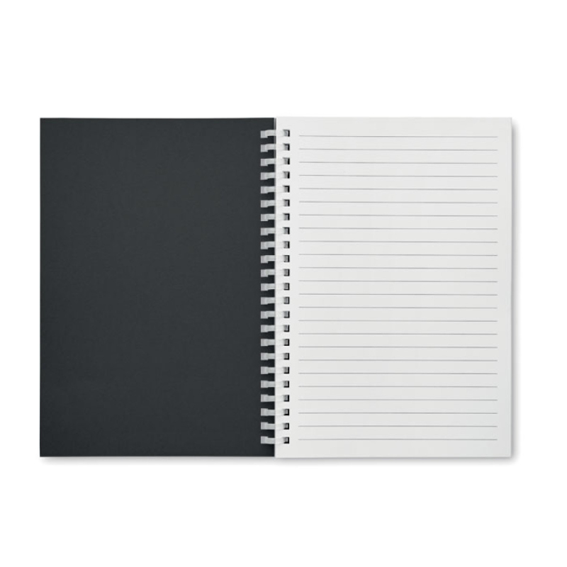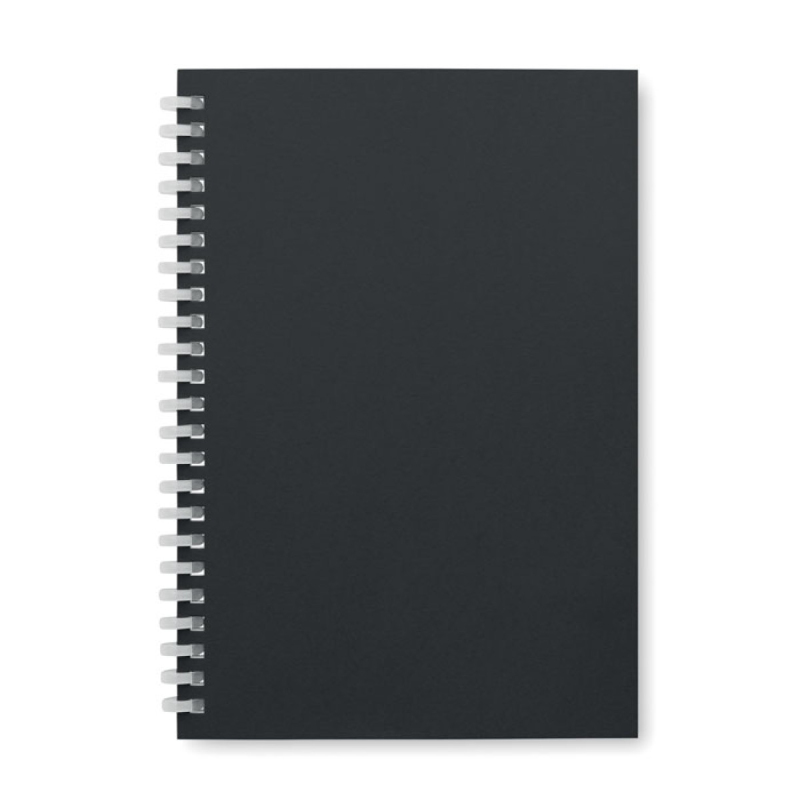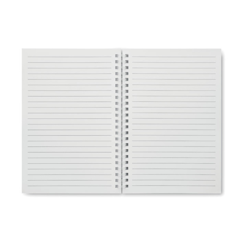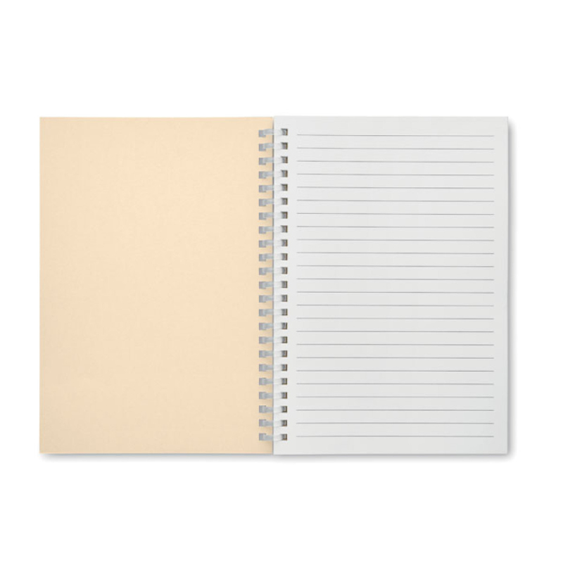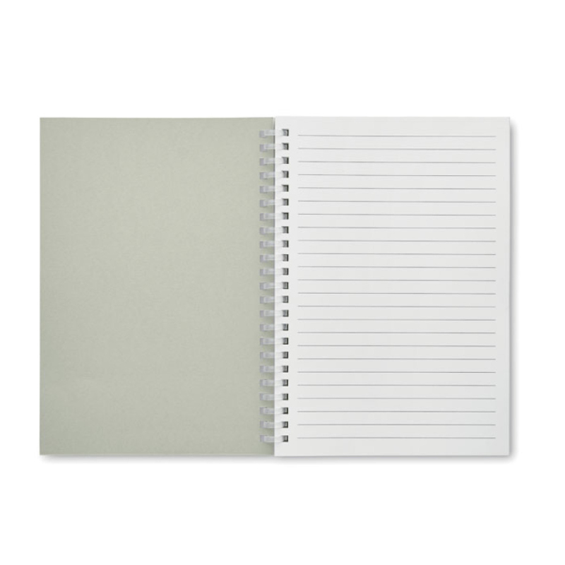 Zápisník A5 s kroužkovou vazbou a měkkou obálkou z recyklovaného kartonu. 160 recyklovaných linkovaných stran (80 listů).