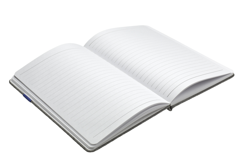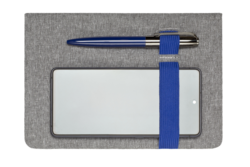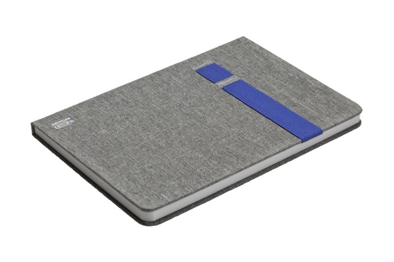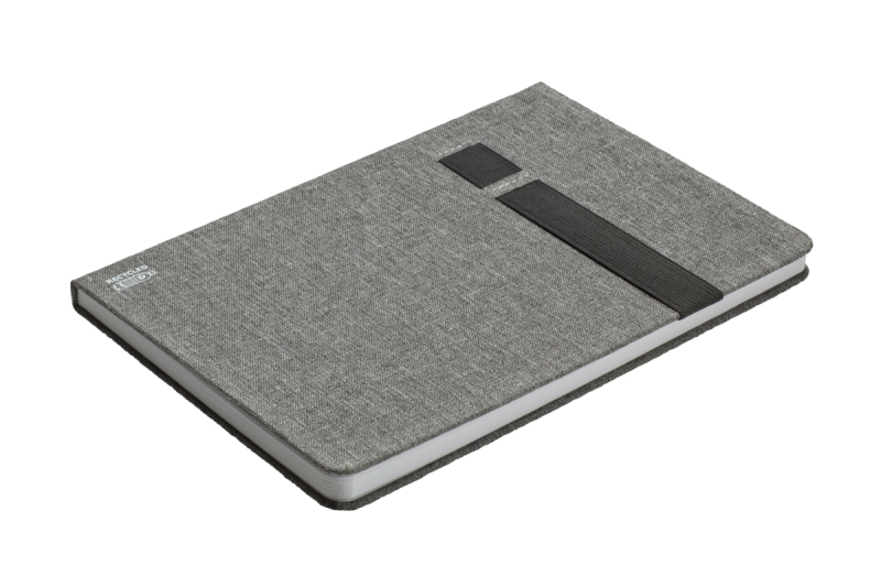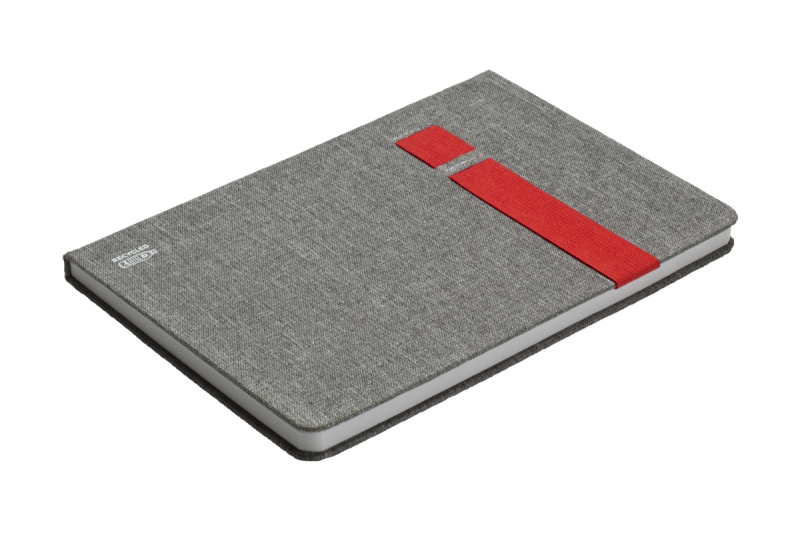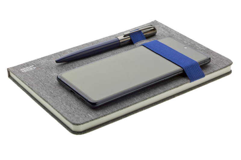 Poznámkový zápisník A5 v deskách z šedého RPET má 80 listů. Blok má poutko na propisku a také na mobilní telefon.