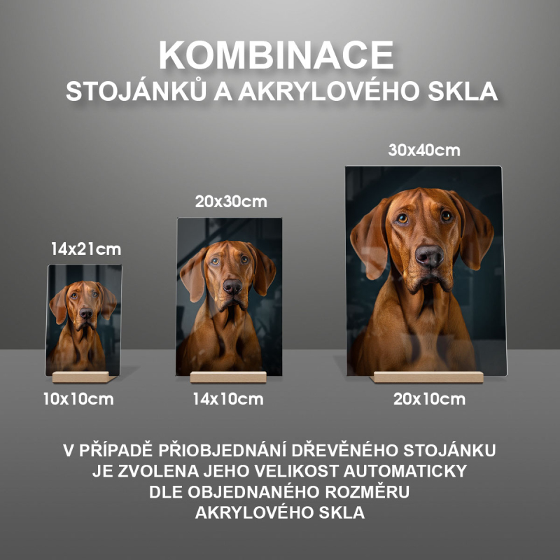 Na produktovém fotu vyobrazena nejoblíbenější varianta akrylového skla 14x21cm a dřevěný stojánek 10x10cm.