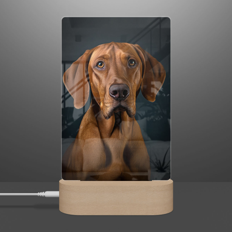 Součástí balení je akrylové sklo dle výběru, dřevěný RGB LED stojánek a napájecí USB kabel.