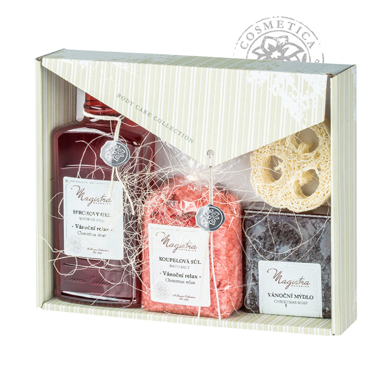 Kazeta obsahuje: sprchový gel Vánoční relax 250 ml, koupelová sůl Vánoční relax 280 g, Vánoční mýdlo