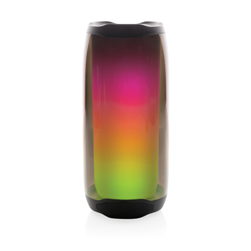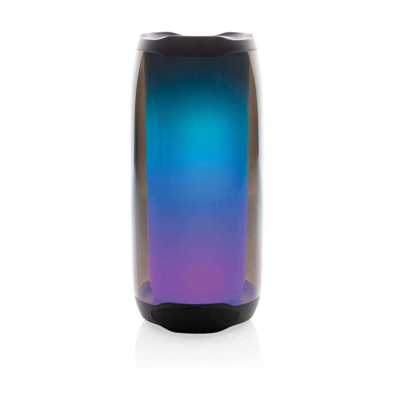 Mimořádně výkonný 10 W reproduktor s efektním 360° RGB světlem. Díky svému provedení poskytuje výjimečně čistý zvuk do všech směrů. Baterie s kapacitou 1800 mAh pro poslech po dobu až 6 hodin. Plné nabití za 4 hodiny. Mikrofon pro telefonování, slot na paměťové karty, AUX a USB port. BT 5.0 pro bezproblémové bezdrátové připojení na vzdálenost až 10 m. Vyrobeno z RCS recyklovaného ABS/PS plastu. RCS (Recycled Claim Standard) je globální standard, který umožňuje ověřit použití recyklovaného materiálu v produktu napříč celým dodavatelským řetězcem. Celkový podíl recyklátu dle váhy produktu: 39%. Včetně nabíjecího kabelu z recyklovaného TPE. Kompletně bez PVC. Baleno v FSC dárkové krabičce.