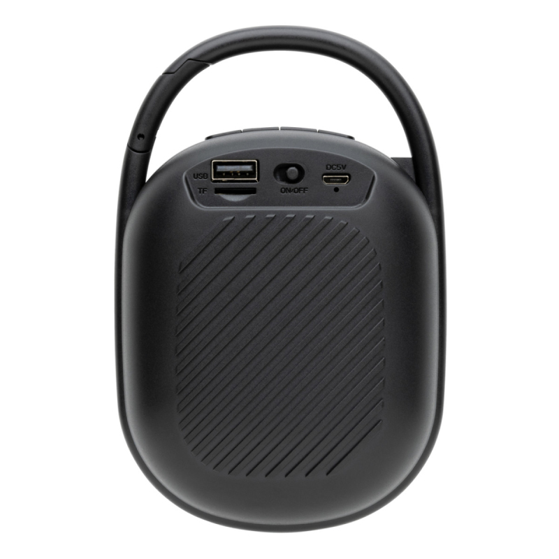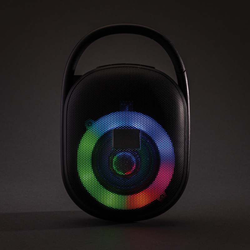 Kompaktní, přesto výkonný 5 W reproduktor s integrovaným RGB světlem a klipem pro zavěšení. Baterie s kapacitou 1200 mAh pro poslech po dobu až 6 hodin. Plné nabití za 4 hodiny. Mikrofon pro telefonování, slot na paměťové karty a USB port. BT 5.0 pro bezproblémové bezdrátové připojení na vzdálenost až 10 m. Vyrobeno z RCS recyklovaného ABS plastu. RCS (Recycled Claim Standard) je globální standard, který umožňuje ověřit použití recyklovaného materiálu v produktu napříč celým dodavatelským řetězcem. Celkový podíl recyklátu dle váhy produktu: 36 %. Včetně nabíjecího kabelu z recyklovaného TPE. Kompletně bez PVC. Baleno v FSC dárkové krabičce.