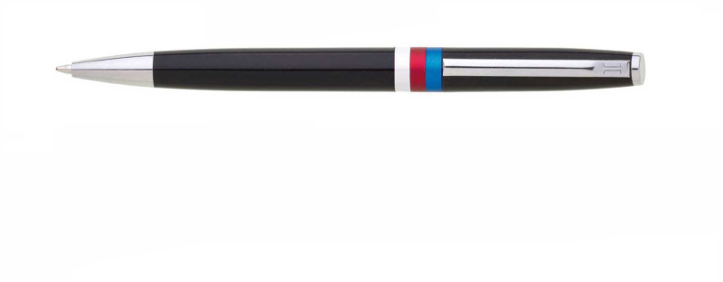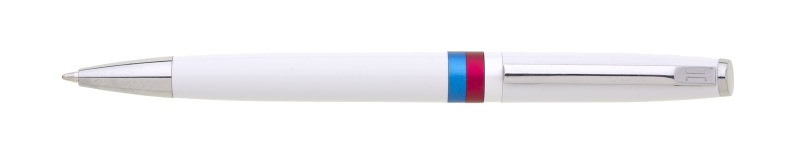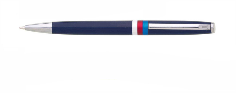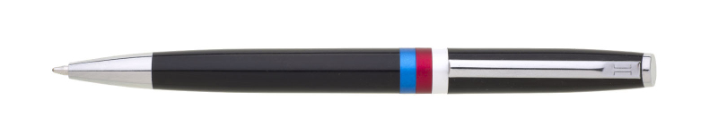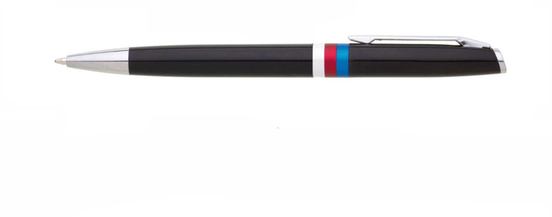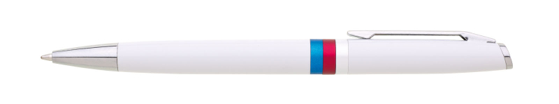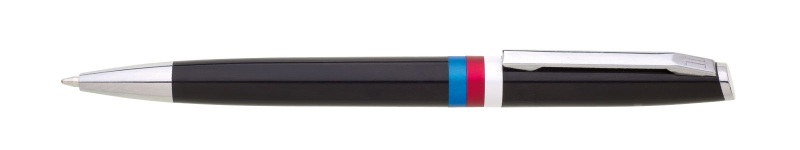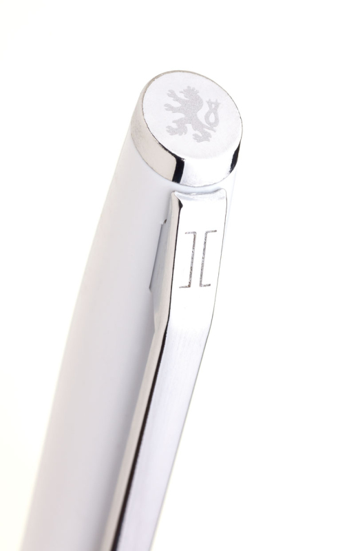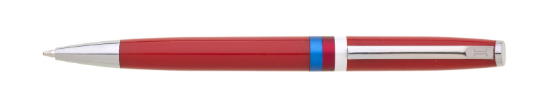 Červená otočná propiska s trikolórou a tiskem lva. Náplň X20, modře píšící.
