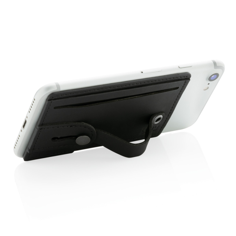 RFID pouzdro na karty s poutkem pro komfortnější držení telefonu či k využití jako stojánek. Prostor pro 2 karty je opatřen RFID ochranou, čímž zabraňuje skimmingu. Lepící plocha na zadní straně pro pevné připevnění na rovnou plochu telefonu. Vyrobeno z PU.