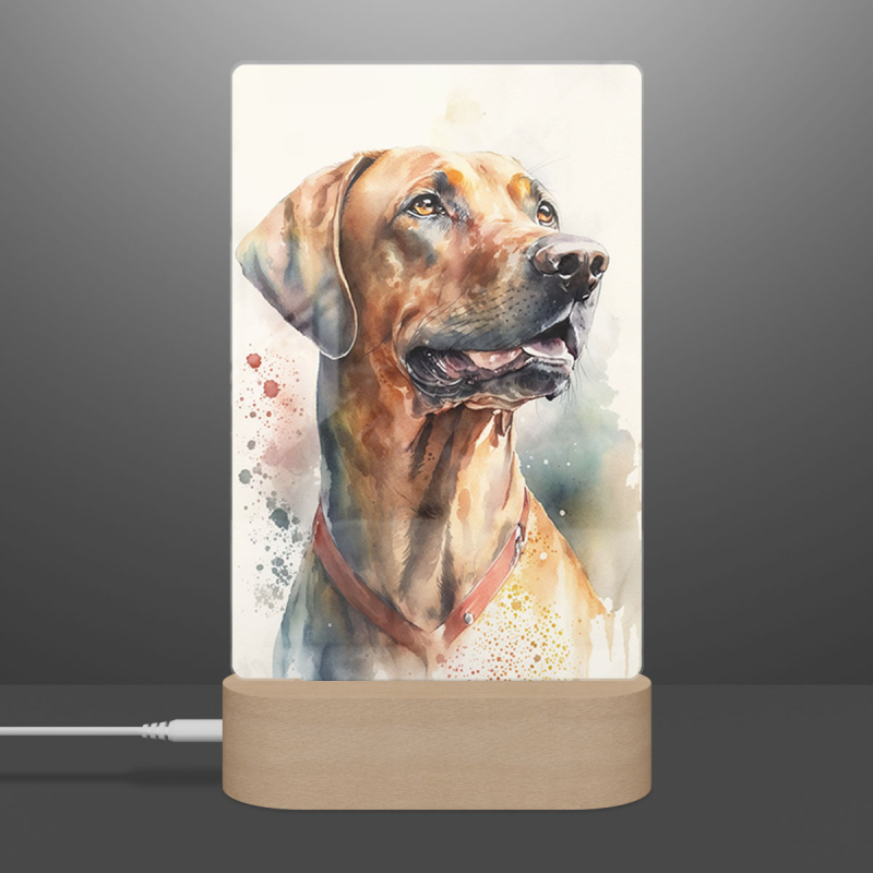 Součástí balení je akrylové sklo dle výběru, dřevěný RGB LED stojánek a napájecí USB kabel.