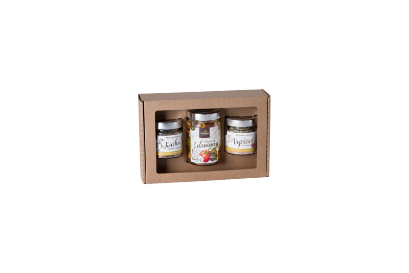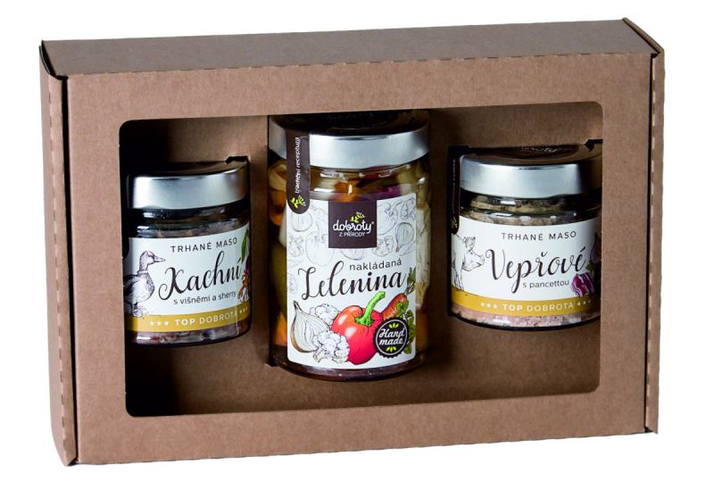Obsahuje: Nakládaná zelenina 290 g (150 g), Trhané vepřové maso s pancettou 140 g, Trhané kachní maso s višněmi a Sherry 140 g. Trvanlivost: 18 měsíců.