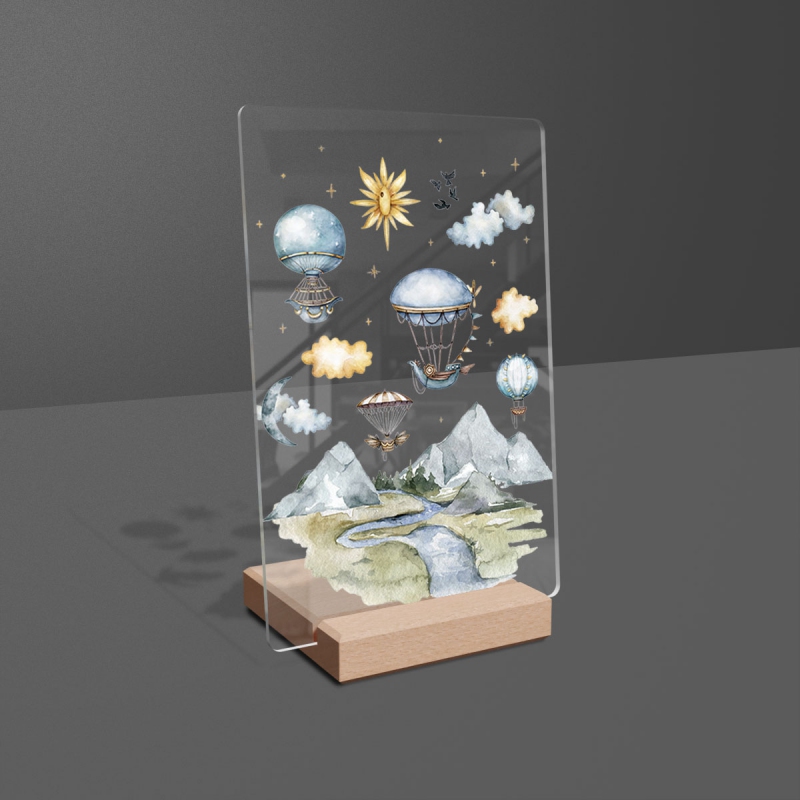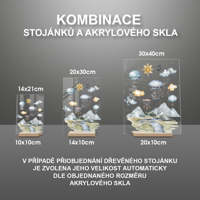 Na produktovém fotu vyobrazena nejoblíbenější varianta akrylového skla 14x21/21x14cm a dřevěný stojánek 10x10cm.