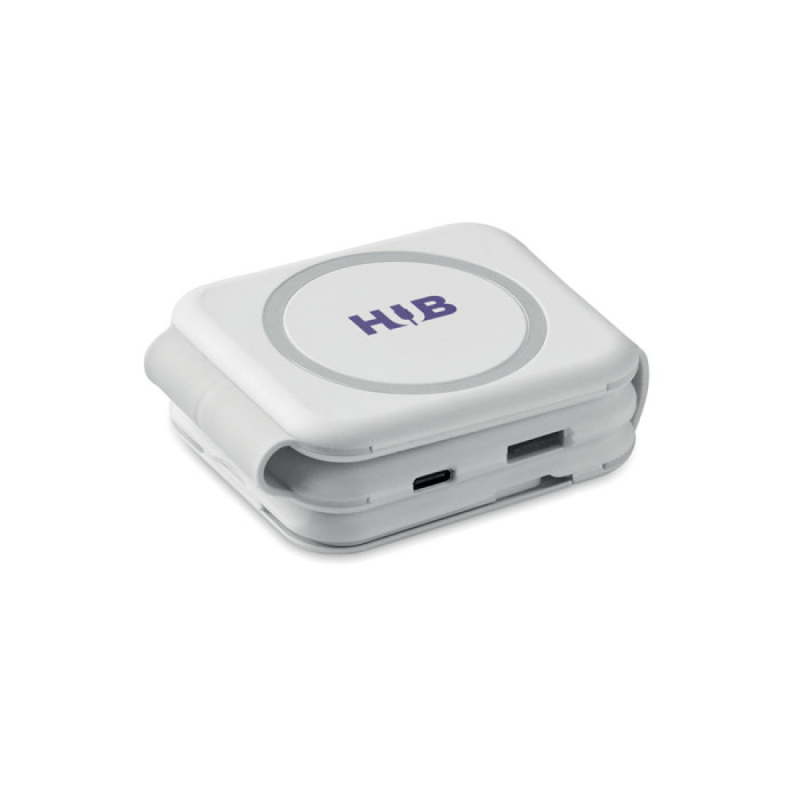 Magnetická nabíjecí stanice z ABS. 3 plochy pro bezdrátové nabíjení. 1x 15 W, 1x 5 W pro TWS a 1 nabíječka pro Apple Watch (3 W). 2 konektory Type-C a 2 konektory USB-A. Integrovaný kabel.