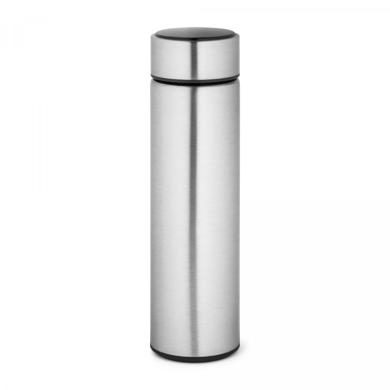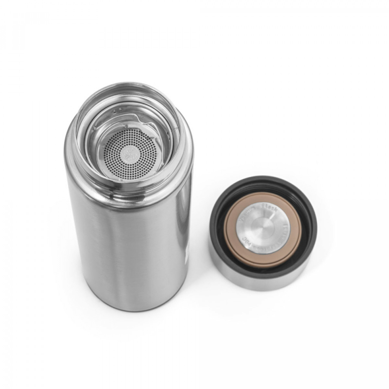 Nerezová láhev s víčkem s digitálním teploměrem. Dvojité vakuově izolované tělo s kapacitou až 470 ml. Součástí je vyluhovač na čaj. Udrží nápoje teplé po dobu 8 hodin a studené po dobu 24 hodin. Dodáváno v krabici. ø65 x 229 mm