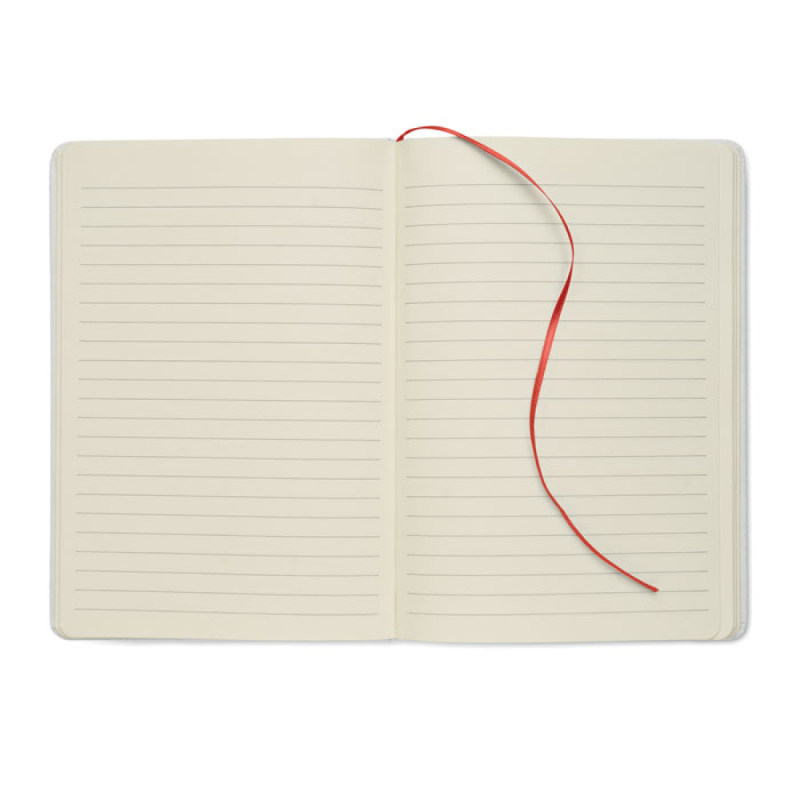 Zápisník A5 s tvrdými deskami vyrobenými ze 70 % z recyklovaných kartonů od mléka a 30 % z recyklovaného papíru. Po laserovém gravírování se odkryje základová barva. 160 stran linkovaného recyklovaného papíru (80 listů). Elastický pásek a záložka ladící s barvou základu.