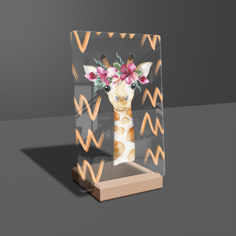 Na produktovém fotu vyobrazena nejoblíbenější varianta akrylového skla 14x21/21x14cm a dřevěný stojánek 10x10cm.