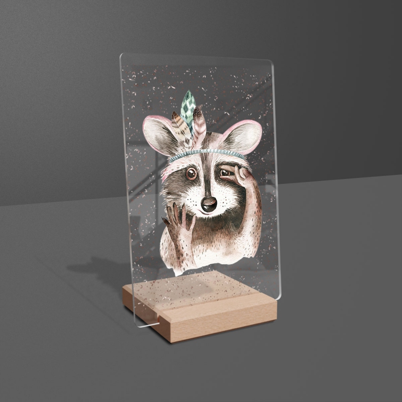 Na produktovém fotu vyobrazena nejoblíbenější varianta akrylového skla 14x21/21x14cm a dřevěný stojánek 10x10cm.
