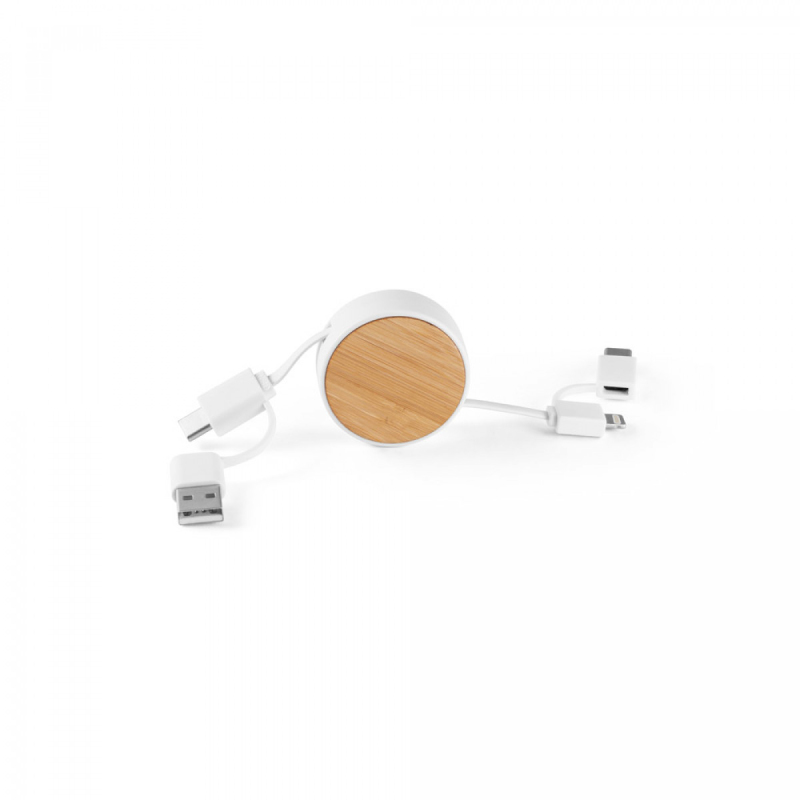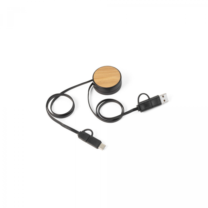 Zatahovací kabel ABS 5 v 1 v bambusové základně. Jeden konec je USB-C s adaptérem pro USB-A, zatímco druhý konec má speciální micro-usb a iOS koncovku 2 v 1 s adaptérem pro USB-C. Vstup/výstup: 5V/1A. Dodáváno v krabičce z kraftového papíru.47 x 130 mm | Natažený kabel: 40 x 850 mm