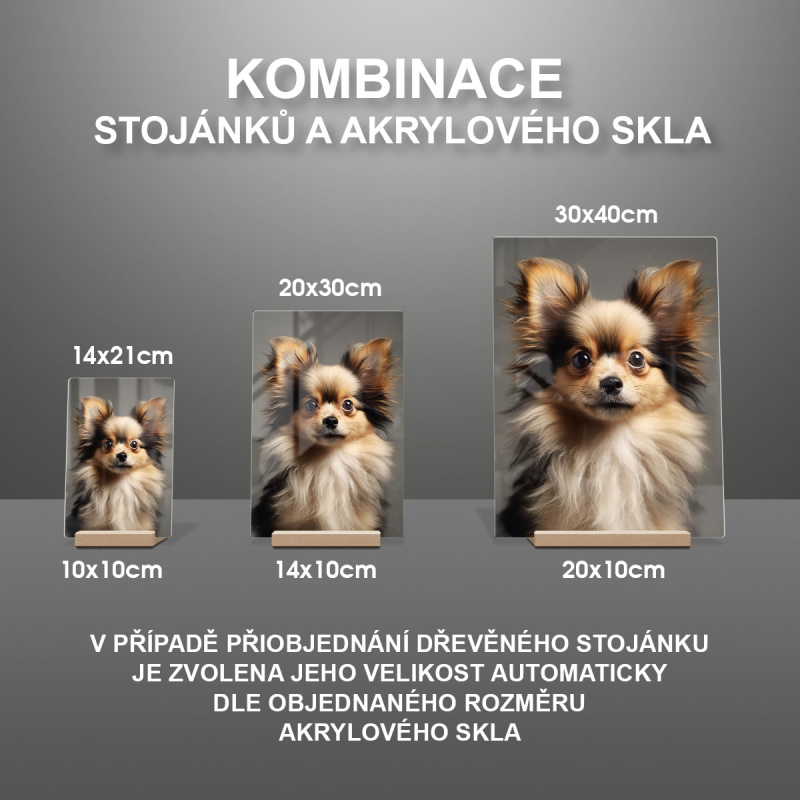 Na produktovém fotu vyobrazena nejoblíbenější varianta akrylového skla 14x21cm a dřevěný stojánek 10x10cm.