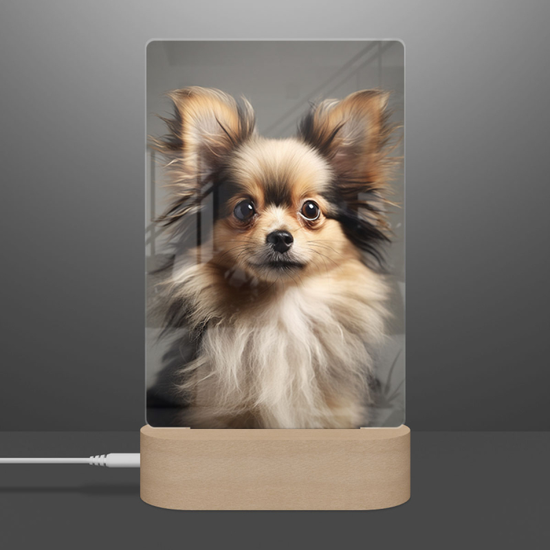 Součástí balení je akrylové sklo dle výběru, dřevěný RGB LED stojánek a napájecí USB kabel.