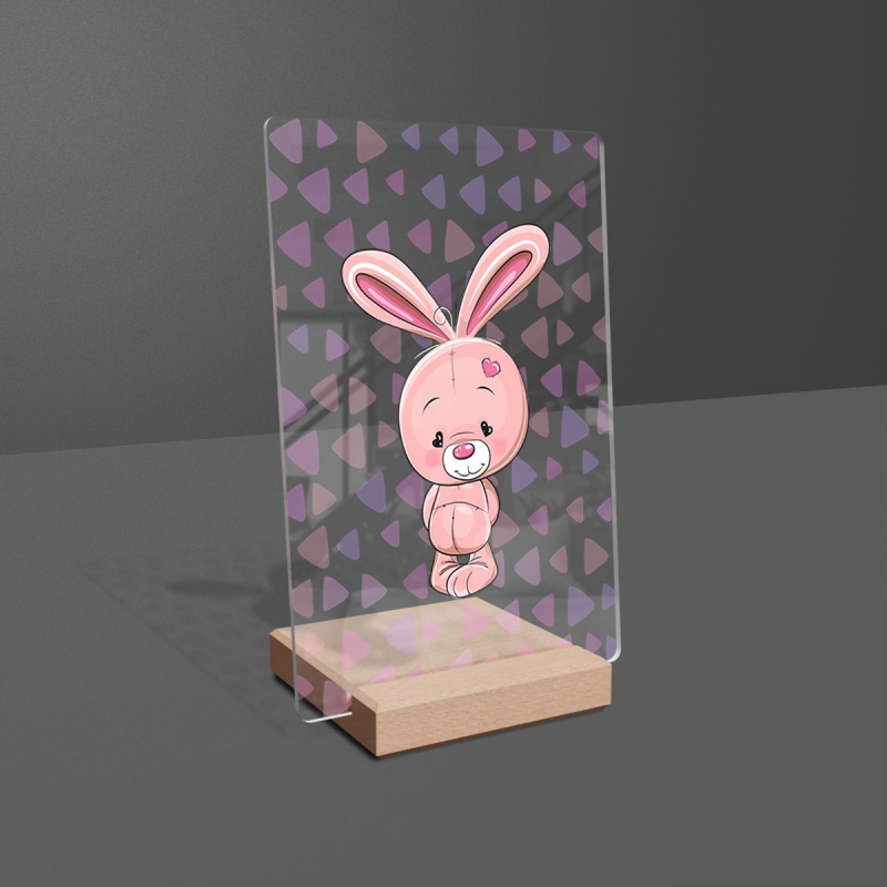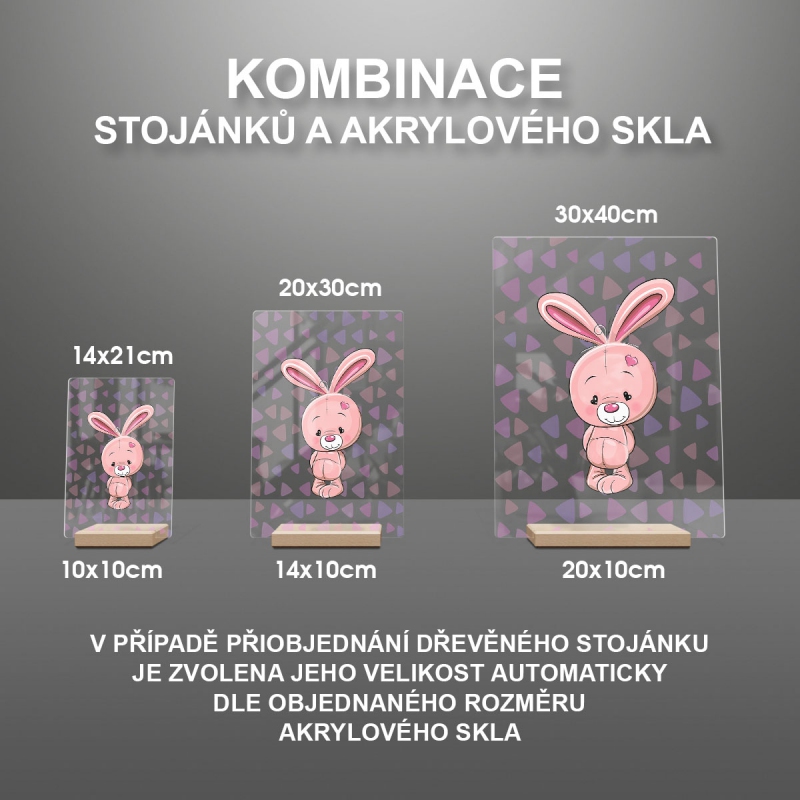 Na produktovém fotu vyobrazena nejoblíbenější varianta akrylového skla 14x21/21x14cm a dřevěný stojánek 10x10cm.