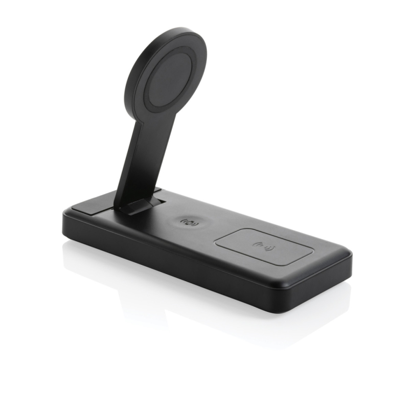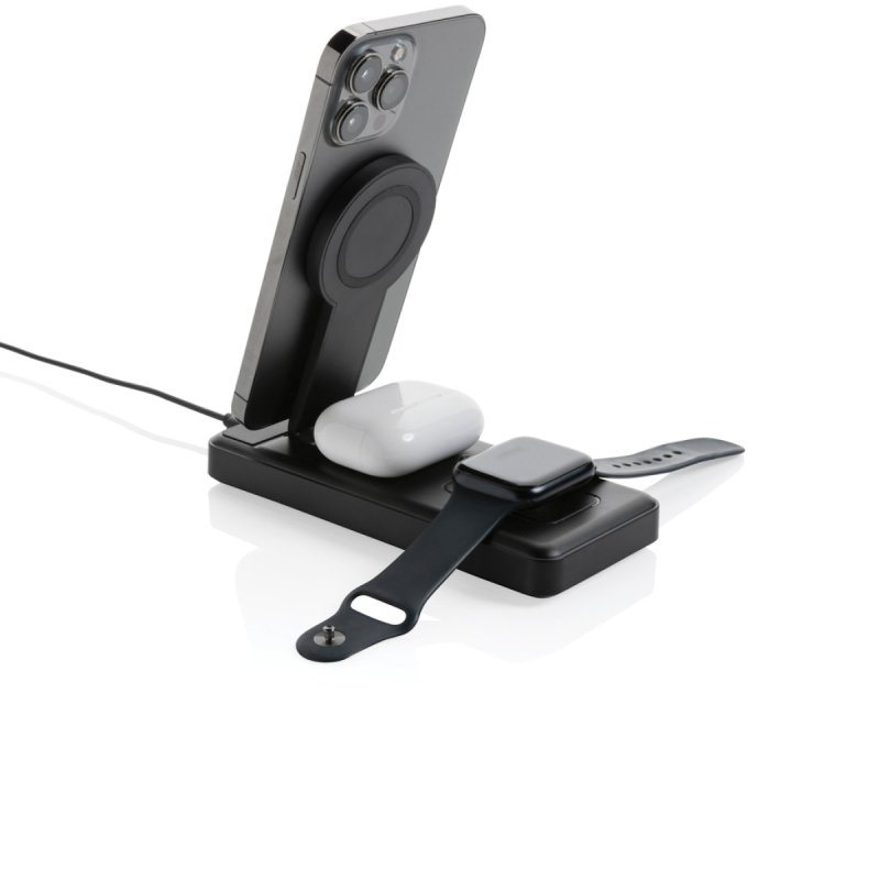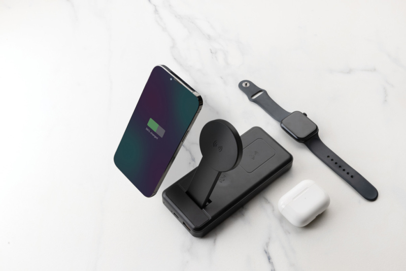 Powerbanka s unikátním designem 3 v 1. Obsahuje skládací stojánek na telefon s integrovanou magnetickou 15 W bezdrátovou nabíječkou, sekundární 5 W bezdrátovou nabíječku pro menší zařízení (např. sluchátka) a třetí 2,5 W bezdrátovou nabíječku na chytré hodinky s iOS. Vyrobená z recyklovaného ABS plastu s RCS certifikací. RCS (Recycled Claim Standard) je globální standard, který umožňuje ověřit použití recyklovaného materiálu v produktu napříč celým dodavatelským řetězcem. Celkový podíl recyklátu dle váhy produktu: 22 %. Kvalitní lithium polymerová baterie řady A s kapacitou 10 000 mAh. Světelné indikátory stupně nabití. USB C vstup: 5V/2,5A, 9V/2A, 12V/1,5A. USB C výstup: 5V/3A, 9V/2,22A, 12V/1,67A; USB A výstup: 5V/3A, 9V/2A, 12V/1,5A, 5V/4,5A. Včetně nabíjecího kabelu z recyklovaného TPE. Výrobek je kompletně bez PVC. Baleno v FSC® kraftové dárkové krabičce.
