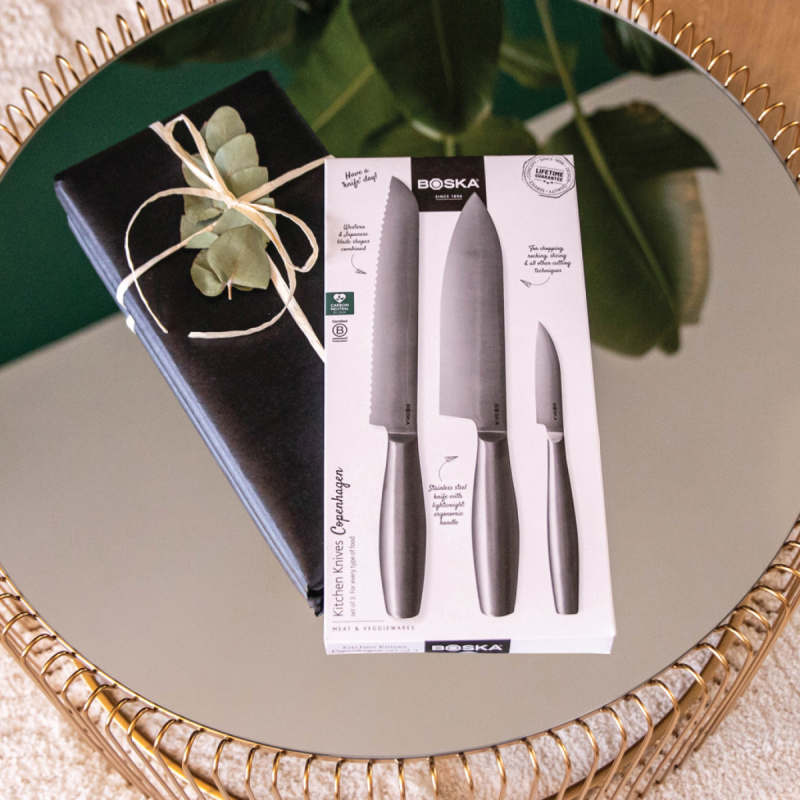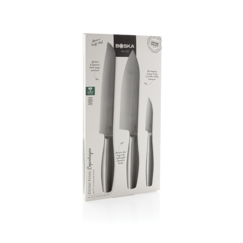 Sada 3 kuchyňských nožů BOSKA Copenhagen nabízí snadné krájení všech druhů potravin. Nože jsou vyrobeny z nerezové oceli, jsou lehké, mají ergonomickou rukojeť a lze je mýt v myčce. Na výrobek je doživotní záruka.