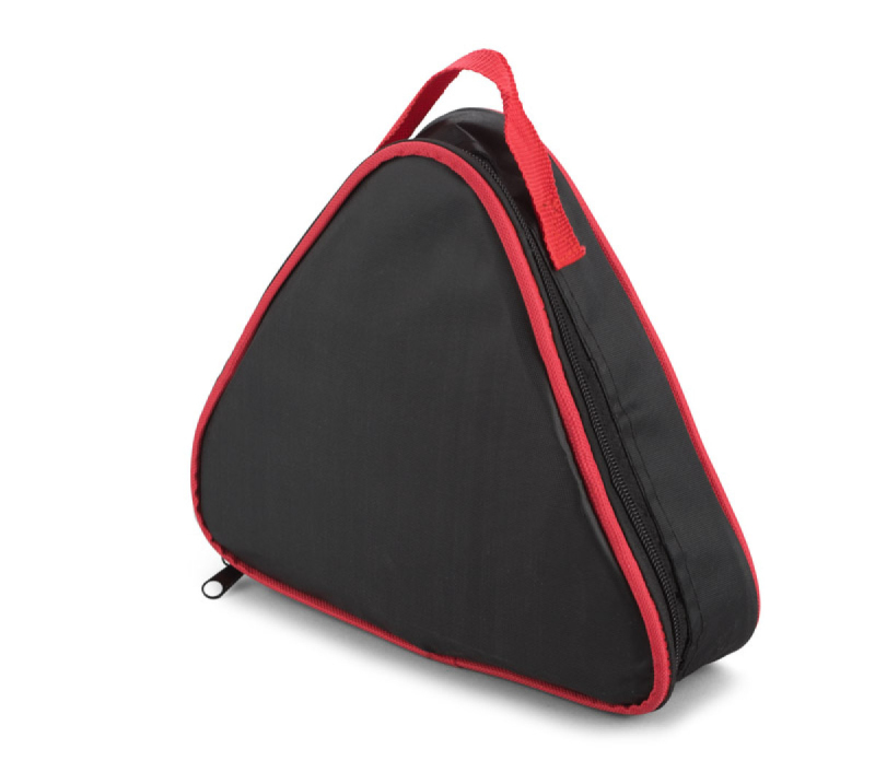Sada automobilového nářadí umístěná v polyesterové tašce, kterou lze díky svému tvaru použít jako výstražný trojúhelník. Sada obsahuje: nabíjecí kabely baterie, tlakoměr v pneumatikách, sadu šroubováků a nástrčných klíčů, baterku na dynamo, ochranné rukavice, nůž a pláštěnku pončo. Logo bude vytištěno sitotískem.