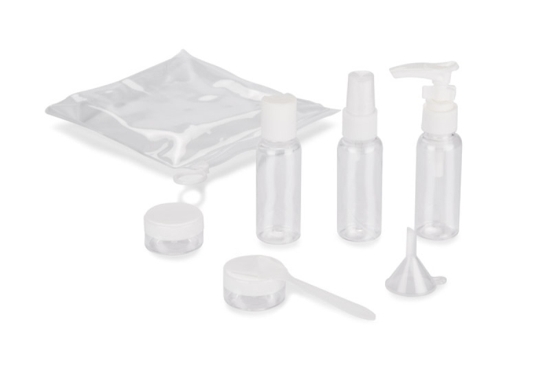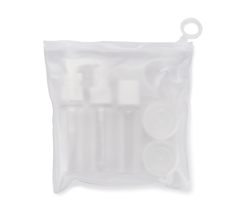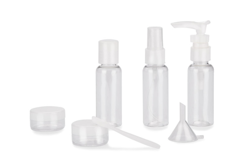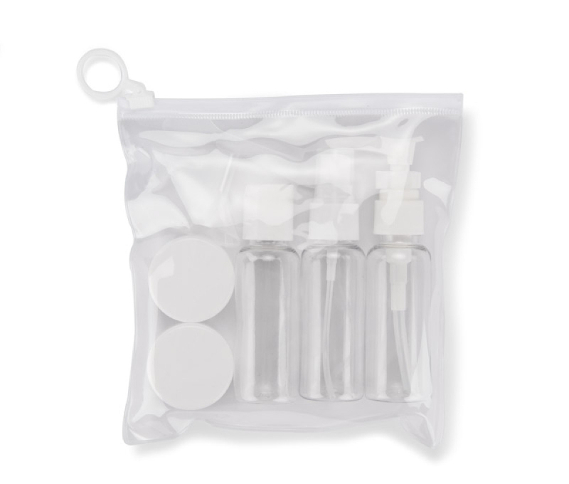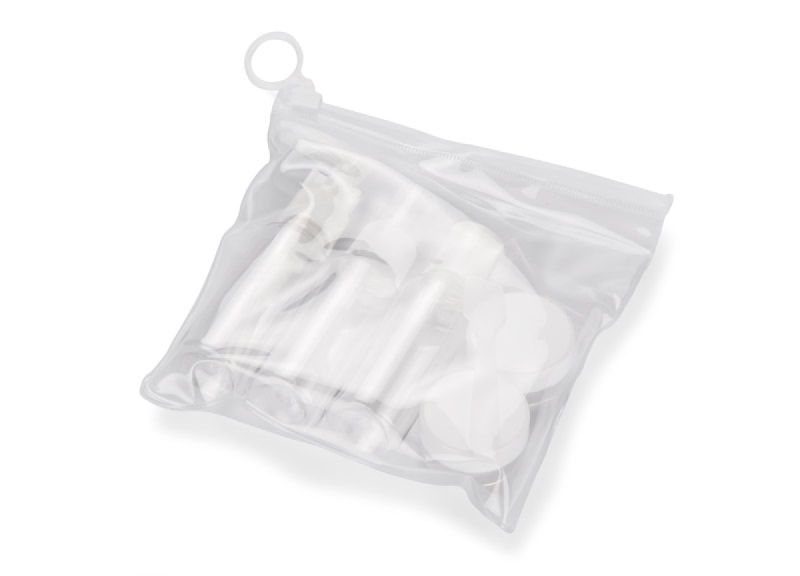 Praktická sada cestovních nádob AIRO umožňuje pohodlné a hygienické skladování kosmetiky během cestování. Skládá se z: lahvičky s rozprašovačem, lahvičky s pumpičkou, lahvičky s uzávěrem a dvou nádobek. Přiložená nálevka usnadňuje přesné nalévání tekutin a lžička je ideální pro vrstvení krémové kosmetiky. Průhledné nádobky s bílými uzávěry usnadňují identifikaci obsahu. Součástí sady je také pouzdro, z jedné strany průhledné a z druhé strany mléčné, se zapínáním na zip. Kompaktní velikost nádobek splňuje požadavky leteckých společností.
