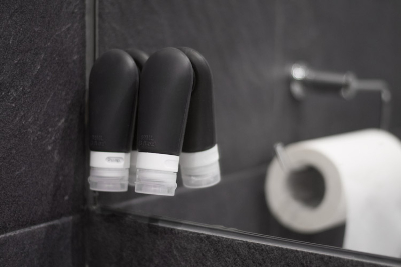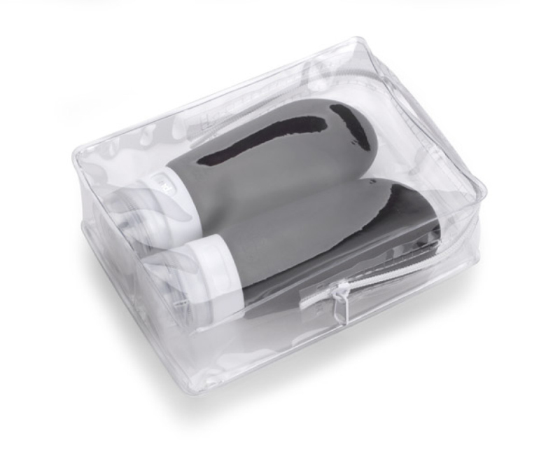 Soustava praktických cestovních nádob OLANNA zabalených do průhledného pouzdra na kosmetiku. Součástí sady jsou dvě silikonové nádoby s objemem 89 ml. Každá nádoba je vybavena přísavkou, díky které se dají připevňovávat k svislým i vodorovným plochám. Nádoba je vybavená šikovným šroubovým uzávěrem s názvy tekutin, které lze nalít do jednotných nádob. Díky speciálnímu nastavení zátky vždy je zřejmé, co je uvnitř. Perfektní sada pro osoby cestující s ručním zavazadlem. Aby bylo možné změnit název kapaliny, je třeba odnímat bílou čepičku a otáčením její vnitřní části zvolit vybraný název obsahu