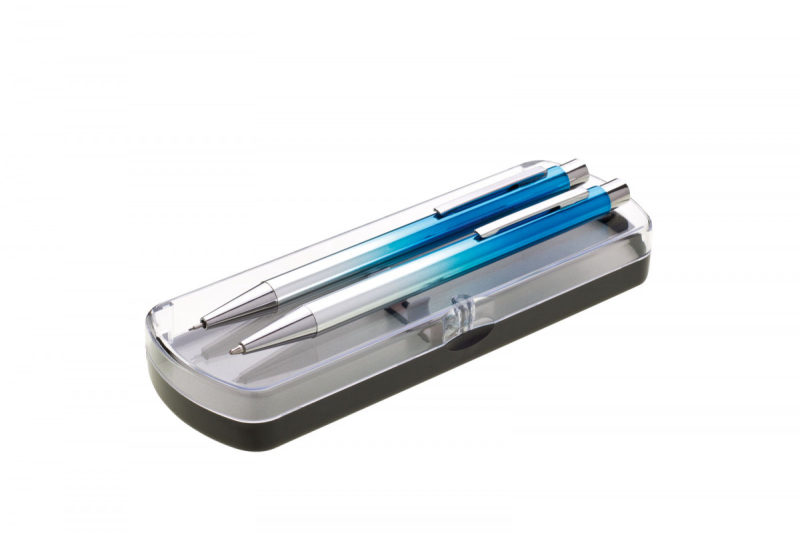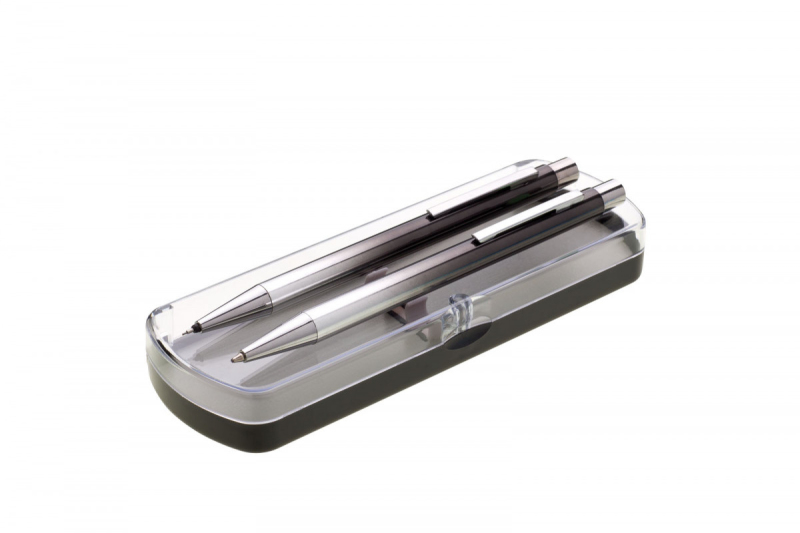 Kovová propiska a mikrotužka mají přechodový efekt barvy od stříbné do červené. Pouzdro je plastové s šedým podkladem.